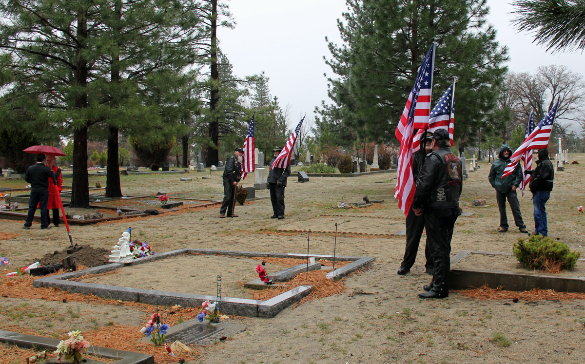The Patriot Guard Riders having been invited by the family of fallen US Army Veteran, Pvt2 Douglas Bowman, to stand and honor during his Interment Service at the Janesville Cemetery, Janesville, CA.. The mission involved a flag line at the Janesville Cemetery, Janesville, CA for family and friends to pass through. After a miscommunication on the Interment site, the Susanville PGR responded to the new location in Janesville in time to present Honors to Pvt2 Douglas Bowman and his family.