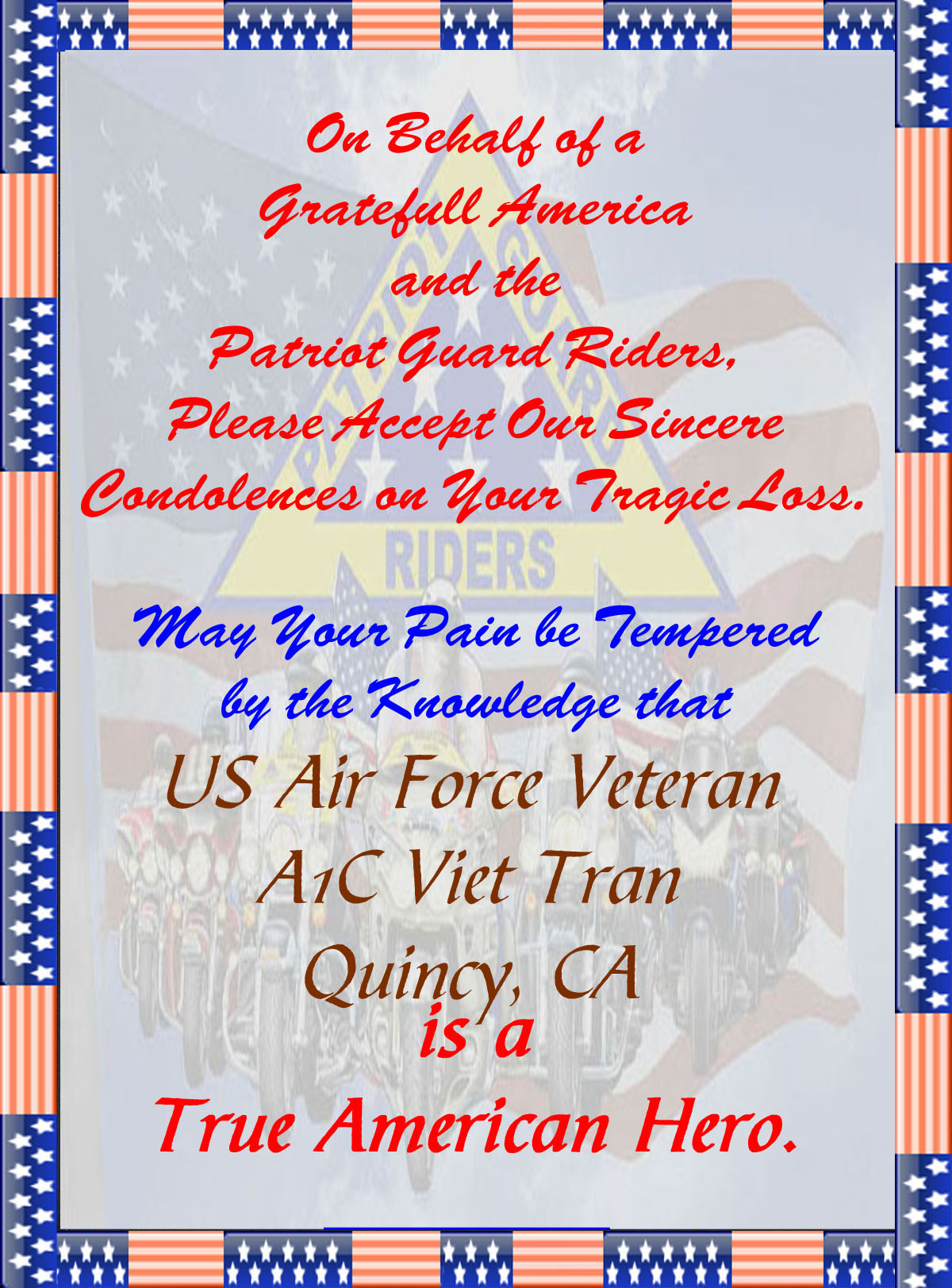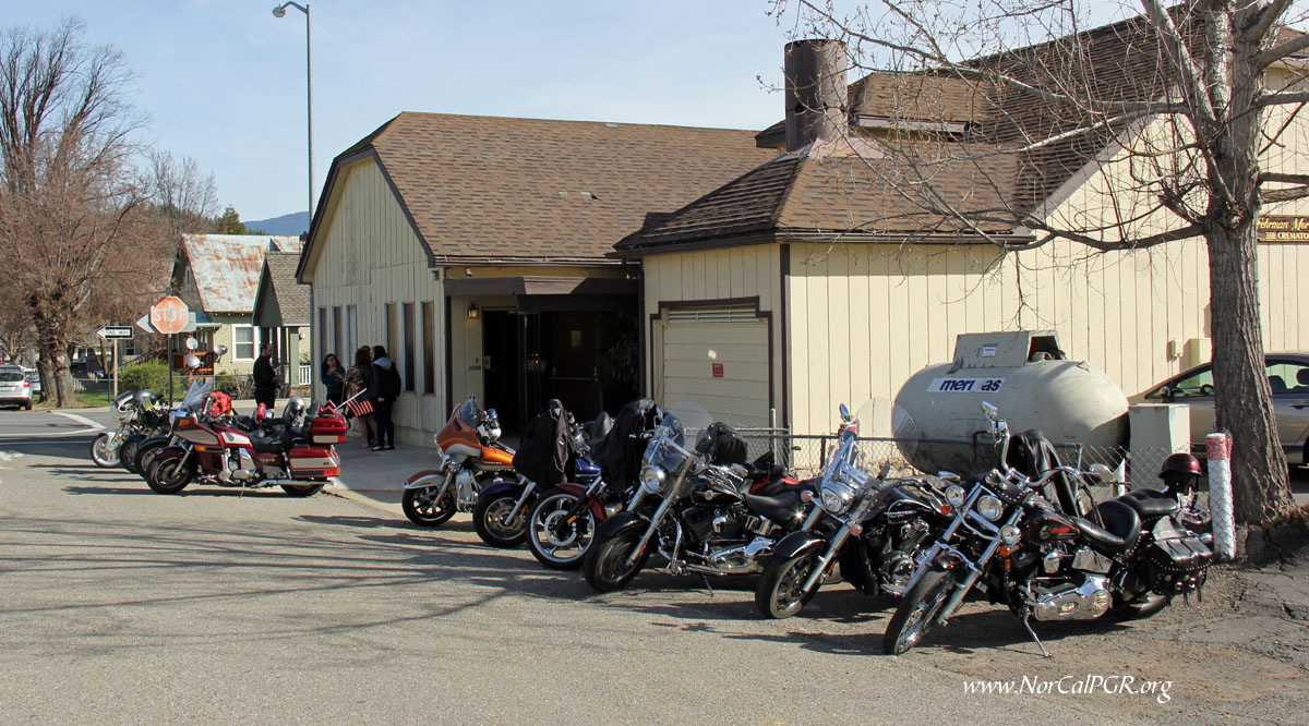 The Patriot Guard Riders having been invited by the family of fallen US Air Force Veteran, A1C Viet Tran, to stand and honor during his Memorial Service at the Fehrman Mortuary, 392 Lawrence Street, Quincy, CA. 95971