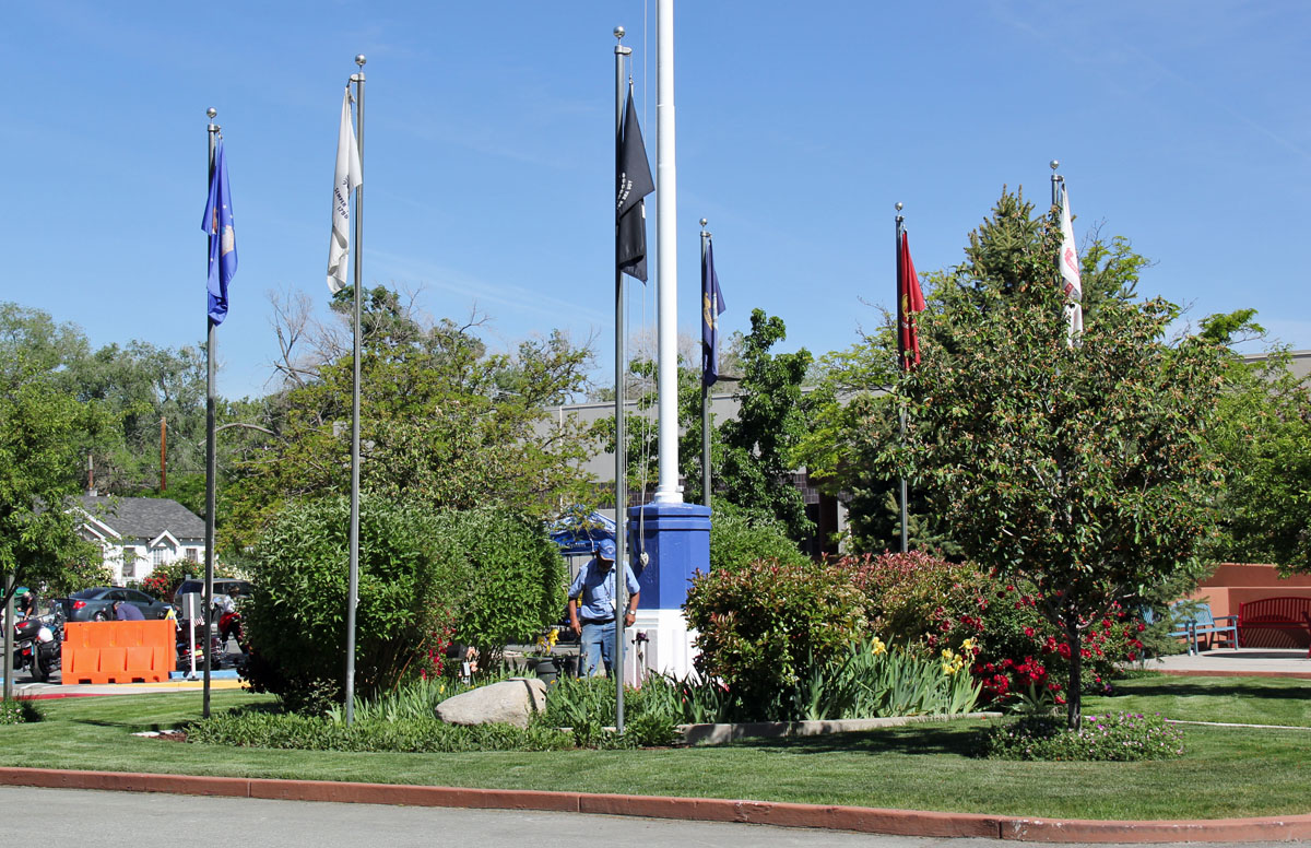 The Patriot Guard Riders having been invited to stand a flag line at the parking lot's entrance welcoming the Veterans' Awareness riders to Reno. The parking lot is located at the Community Living Center (CLC) at the corner of Locust and Taylor Streets.