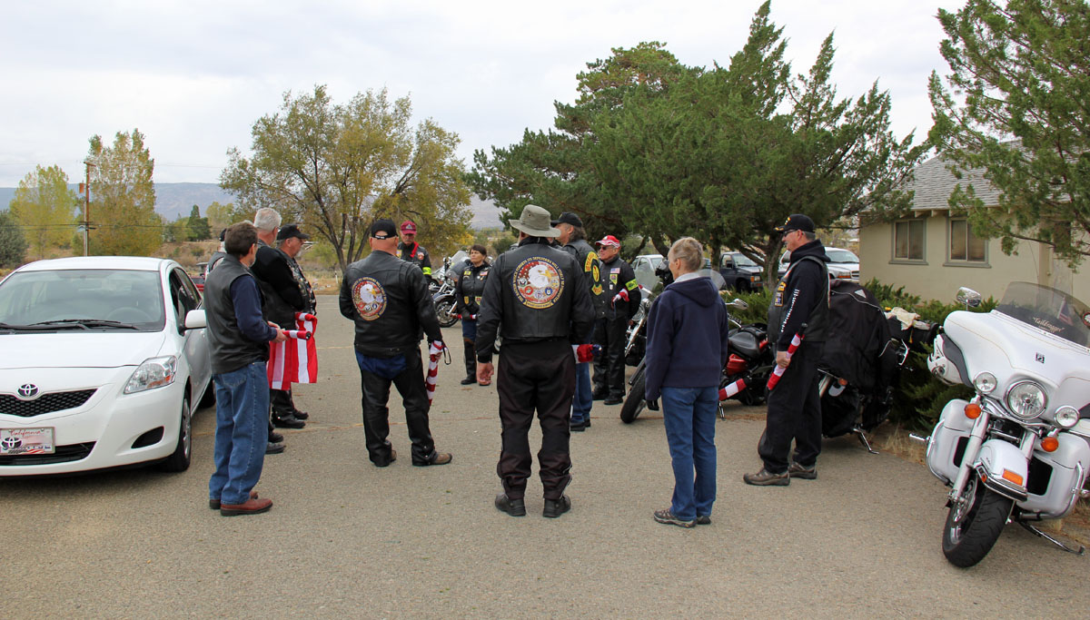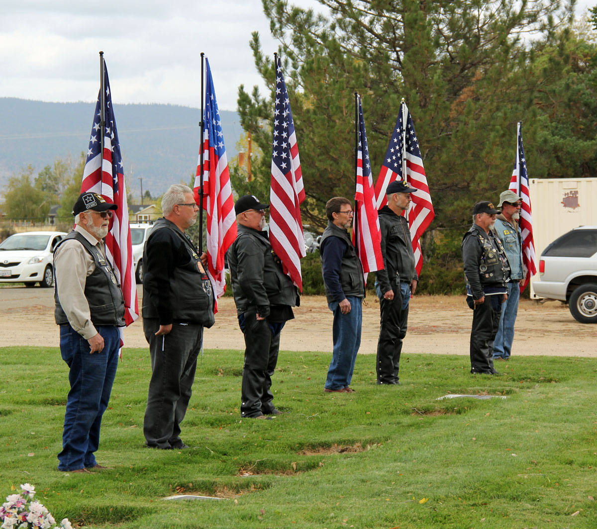 The mission involved a flag line at the Diamond Crest Cemetery, Susanville, CA. for family and friends to pass through. On a cool and overcast fall day, 16 PGR members - 2 cages and 14 motors, showed to present Honors for this true American Hero, where the PGR stood Honor Line at his final resting.