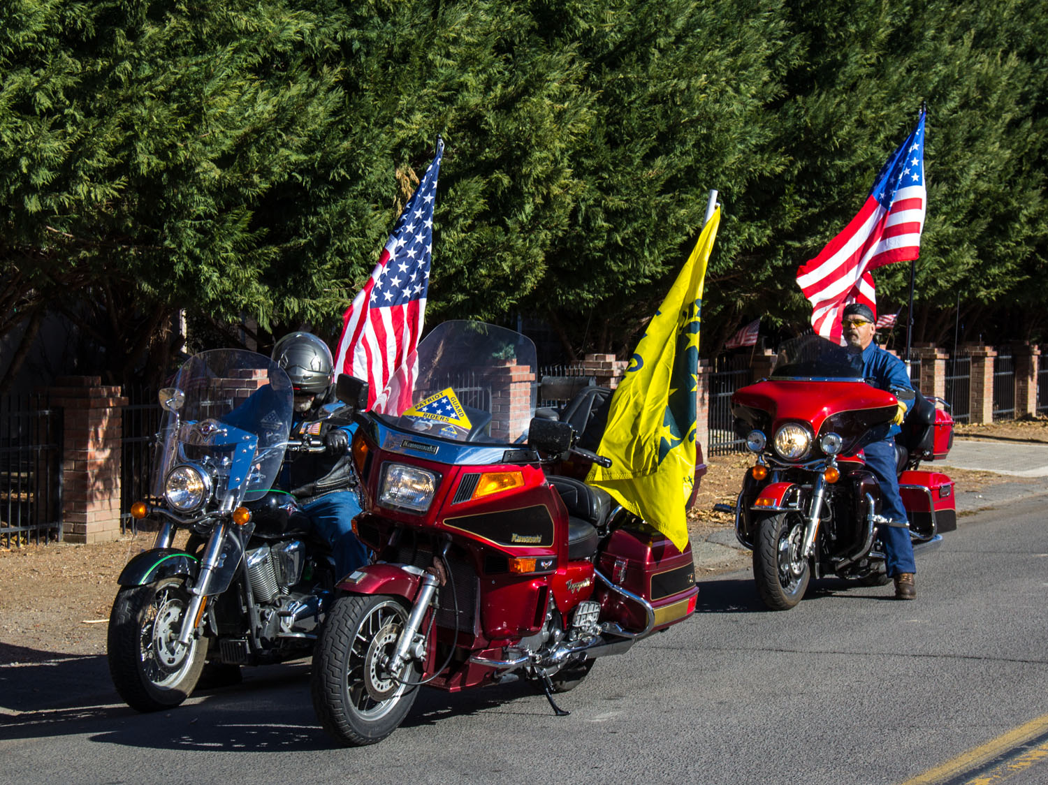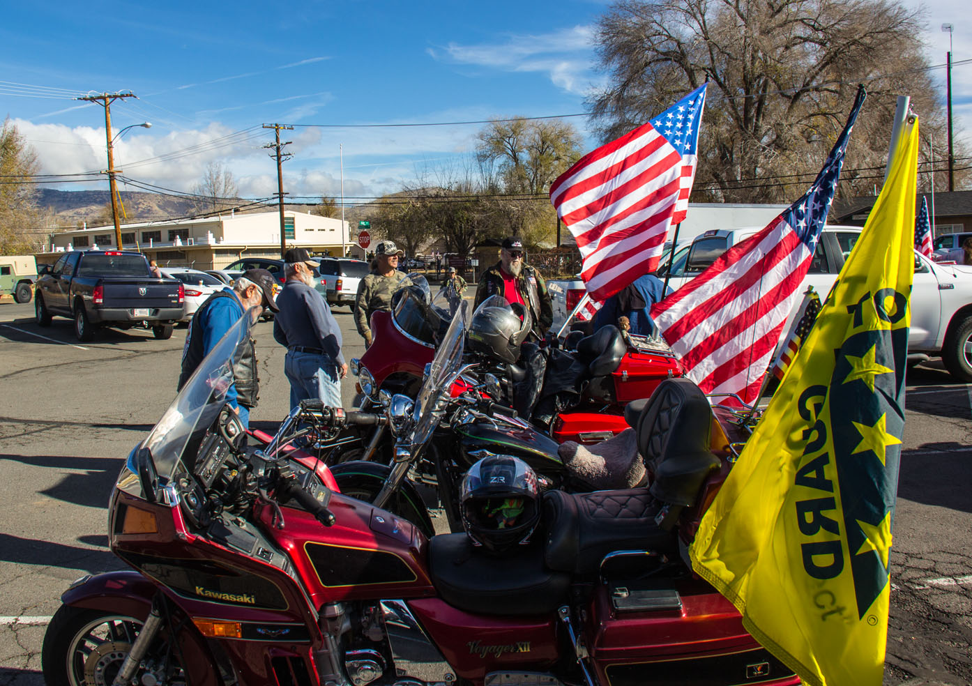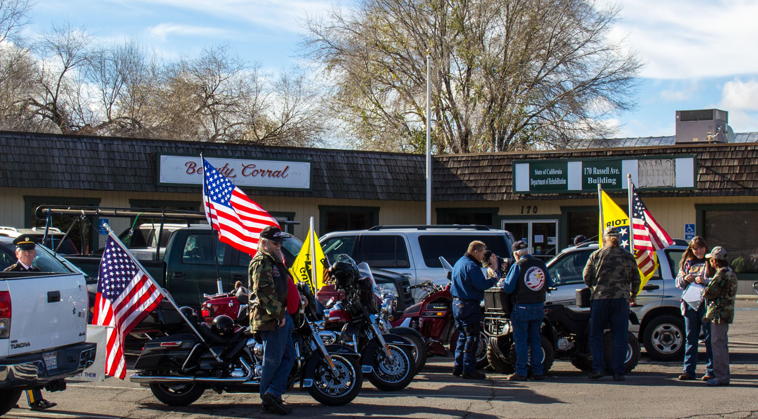 The Patriot Guard Riders having been invited to participate in the Lassen County Susanville, CA Veterans Day Parade. We met at the usual staging area near the Susanville National Guard buildings at 10:00 - 10:15am. A total of 11 PGR in combination of motors and cages, participated. Thank you ALL for showing your support to our Veterans.
