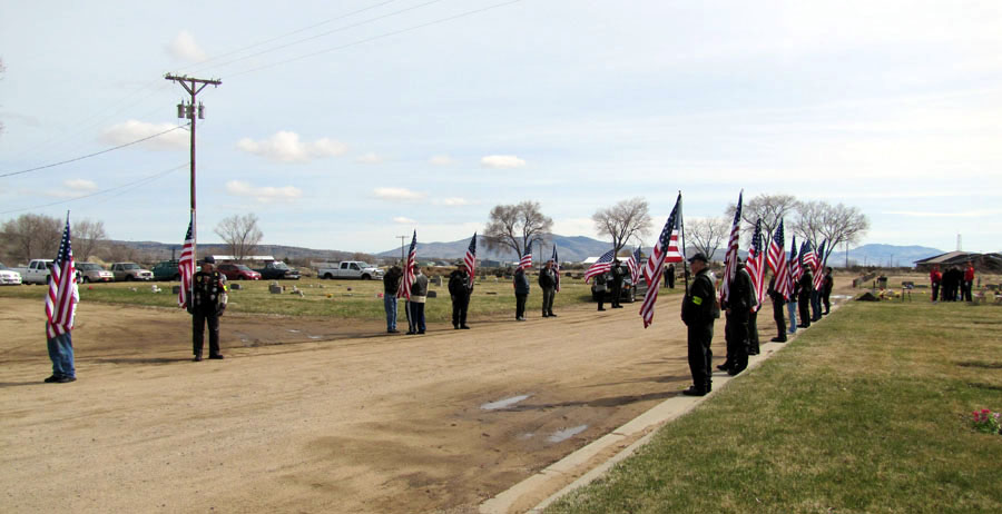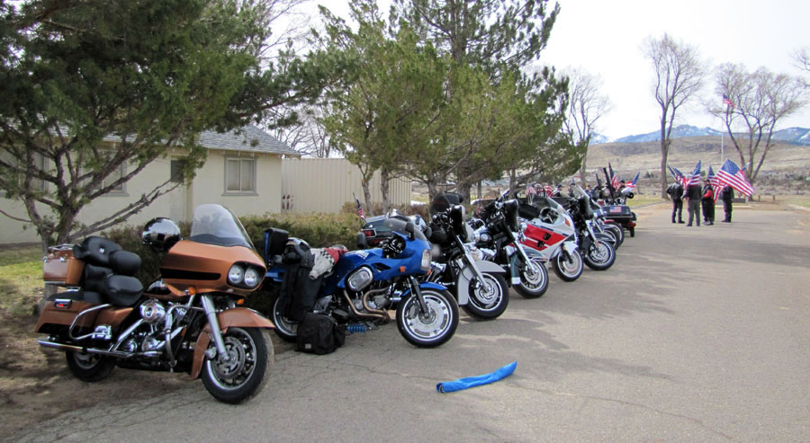 I would like to give a special thanks to Northern Nevada, Reno PGR Dave Kealey and his group who had nine members come to Susanville (6 motors and 3 in a cage) to stand Honor Line with American Fags during this Mission. In addition to our Patriot Guard Riders we had a great representation of many groups on this Mission. They include: