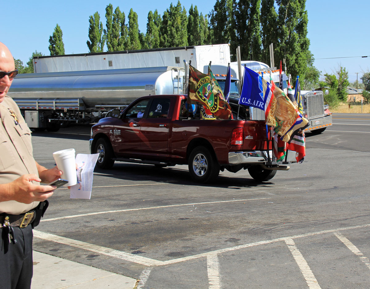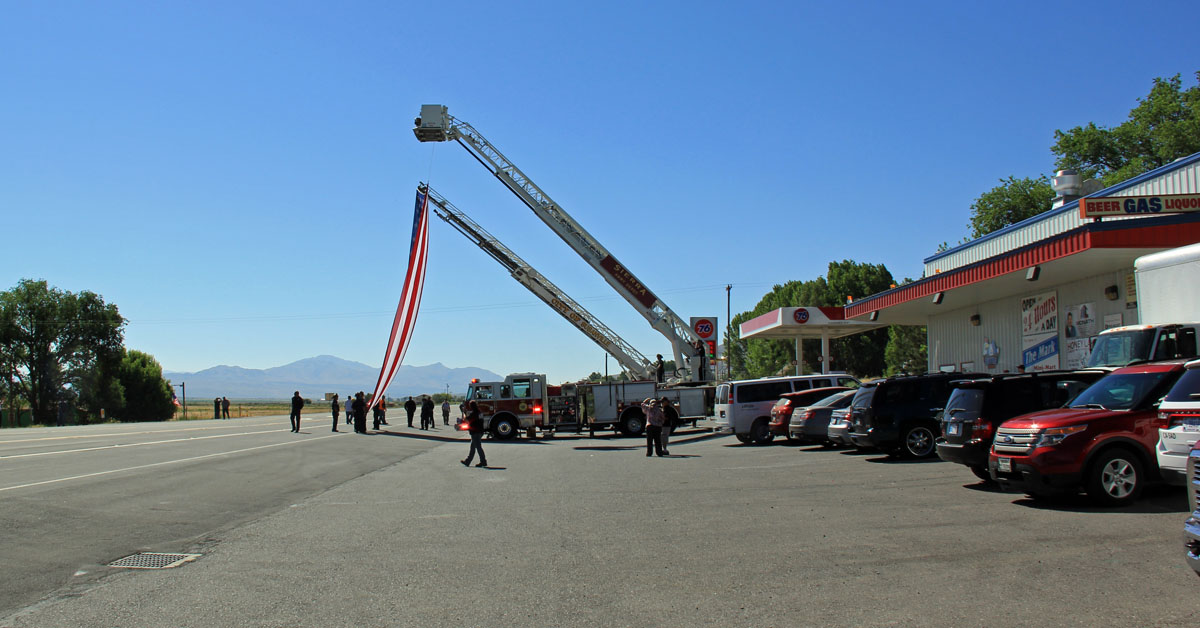 Once at the Mark, everyone was greeted by two Fire Ladder Trucks from the City of Susanville and Sierra Army Depot Fire Dept flying a large American Flag. Standing by there also was Engines from Susan River, Janesville, Herlong, CalFire, Fire Departments and EMS from Herlong. The California Highway Patrol and Lassen County Sheriff Dept escorted all of us from Herlong to Susanville. Upon entering the City of Susanville, Susanville City PD assisted with the escort through town and back to the fairgrounds. We had approximately 50 motorcycles as part of the escort of this Remembrance Wall. Along the route, both outside of town and in town, citizens lined up with Flags showing their support.