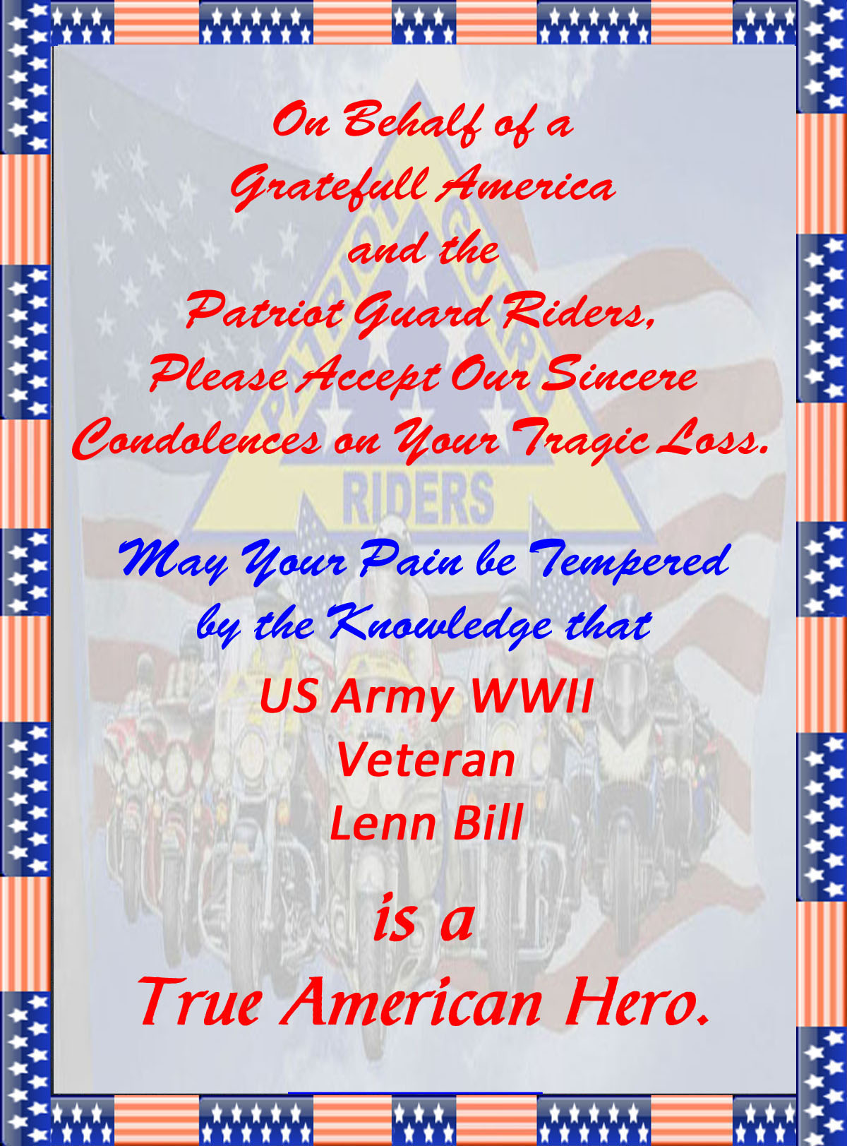 I would like to thank US Army Lenn Bill and his family and friends for their support of Lenn Bill, and for his service to our Country.
